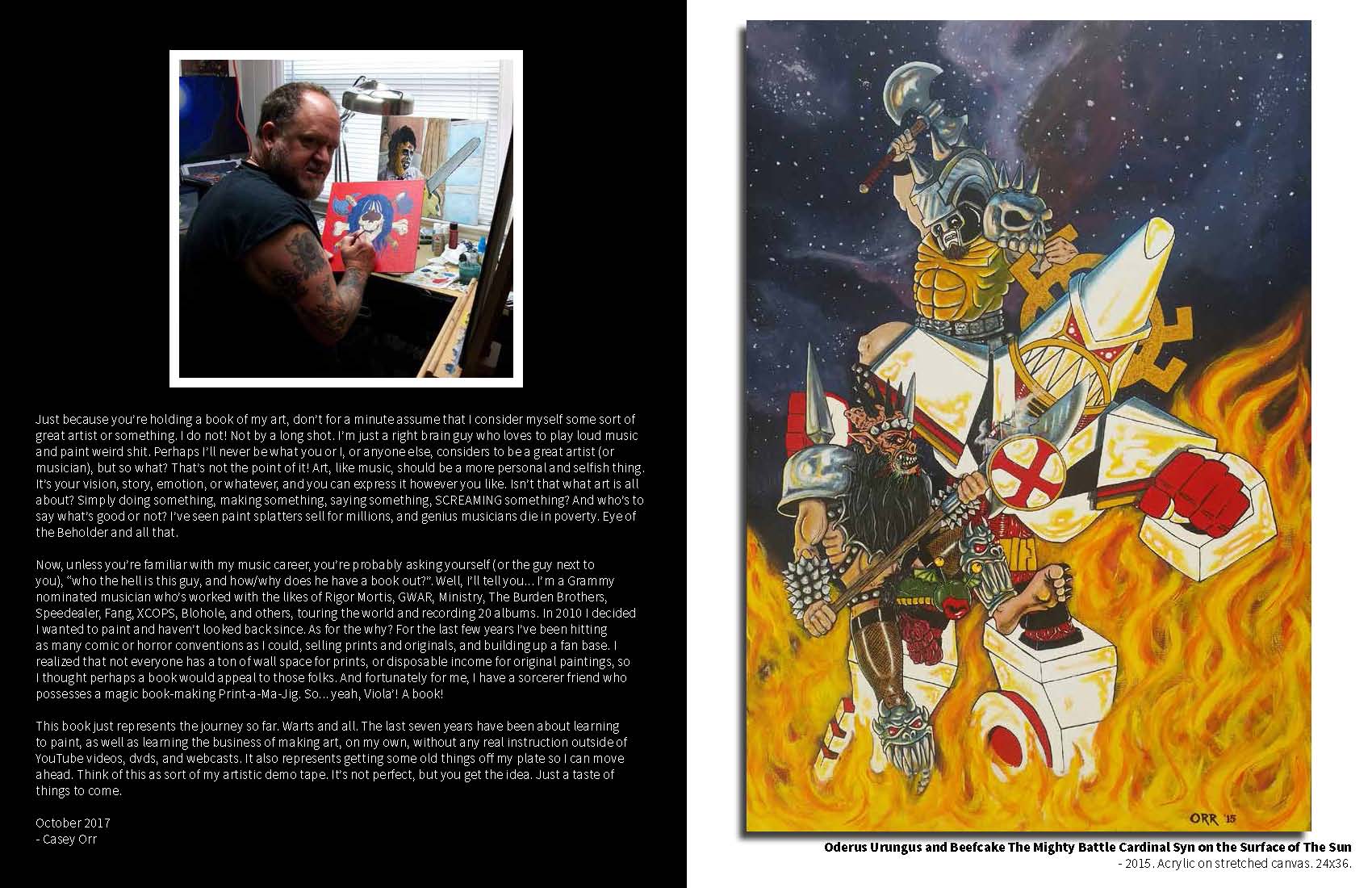 A collection of images painted by Rigor Mortis/GWAR bassist, Casey Orr. 72 page, full color book, featuring almost 150 vibrant images. Printed on high quality paper. Signed by artist. Can be personalized on request.