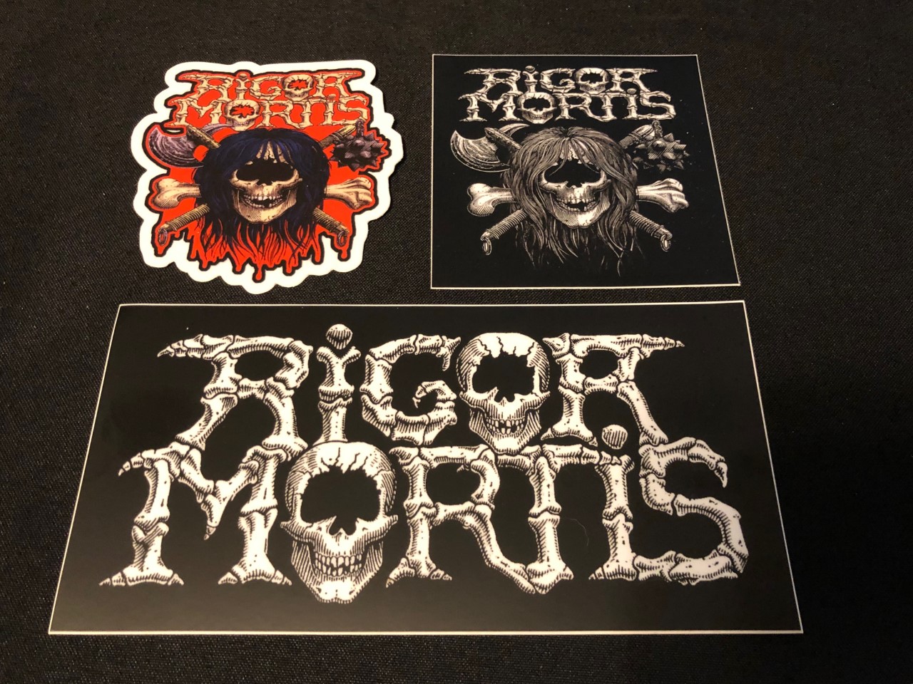 3 pack of Rigor Mortis stickers! One big 4"x8" sticker, and two 4"x4" stickers.